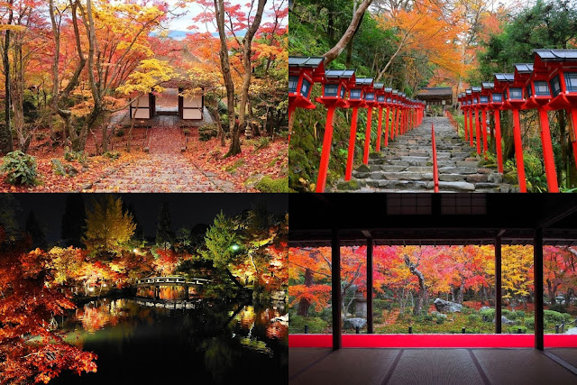 進常寂光寺茅草頂的儉樸山門,眼前有一陡坡,沿石台階而上,可至本堂大殿,而這條坡道兩側為紅葉樹所圍繞,宛如一條紅葉的隧道,本堂大殿後的紅葉叢中,佇立著一座茅草頂的多寶塔,在這裡,自然的諧和誕生了難以表達的天然美。|