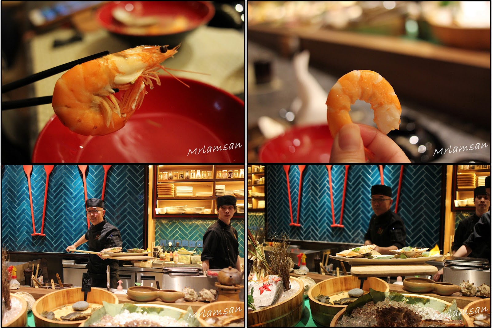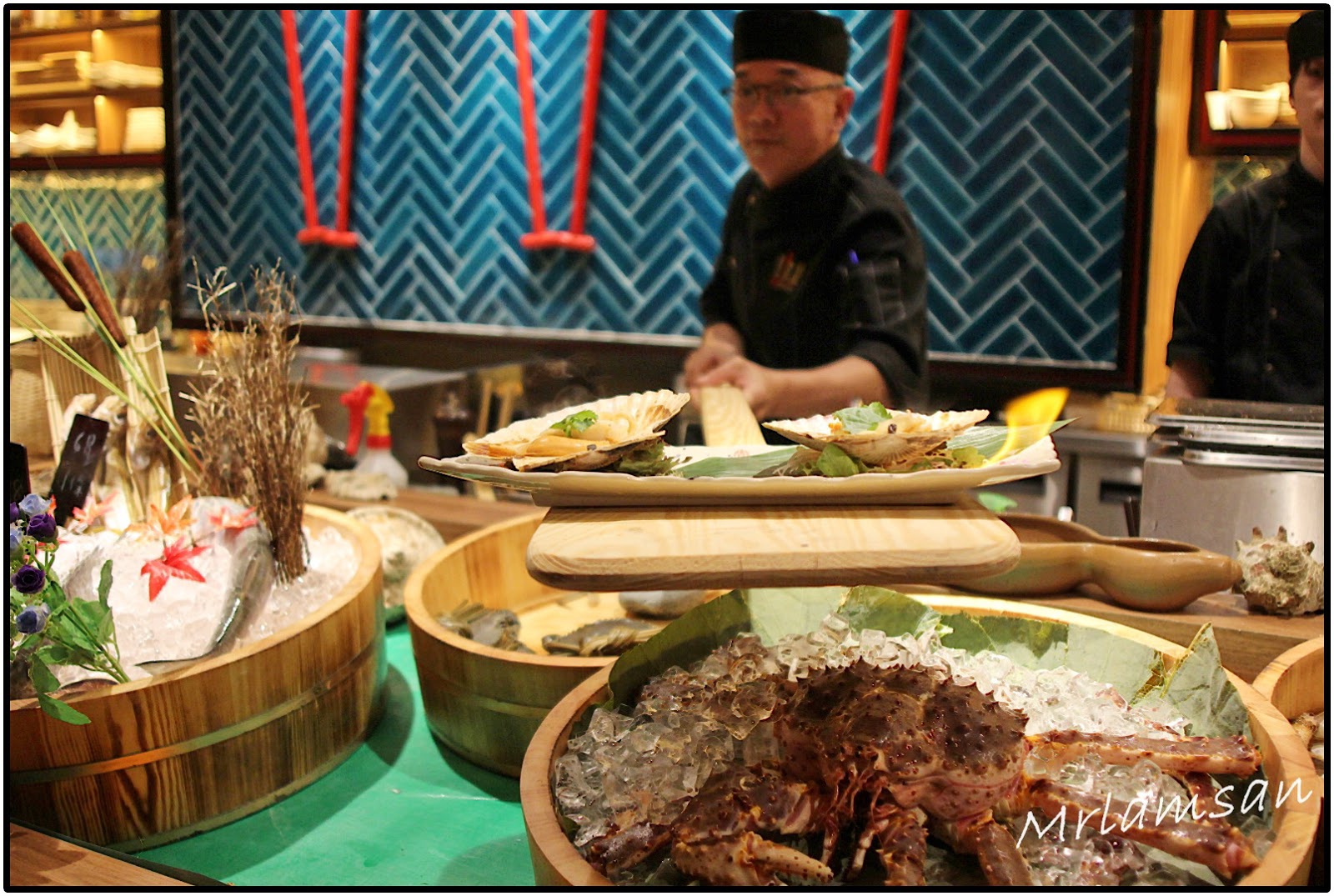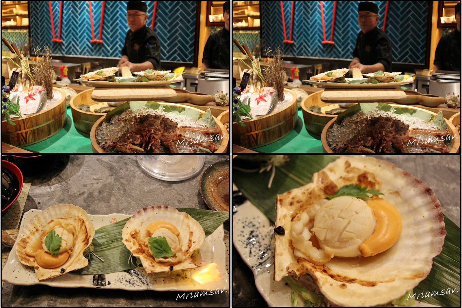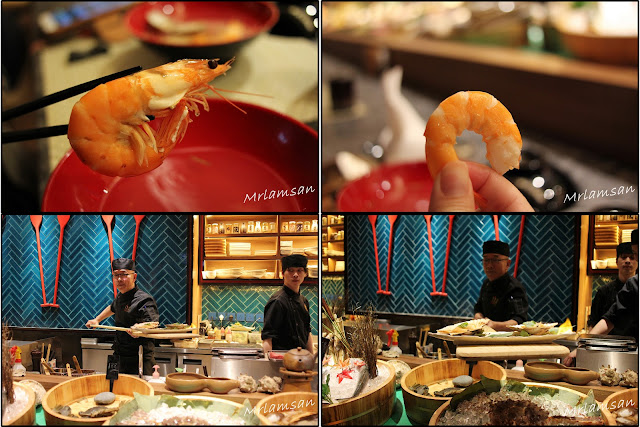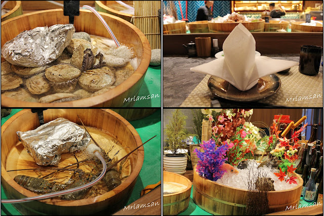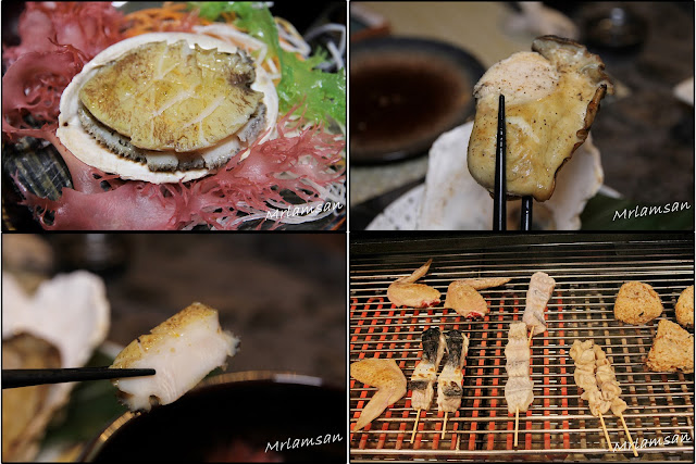吧枱放滿來自世界各地新鮮海鮮,有美國石蠔、蘇格蘭大蟶子、北海道元貝、南非鮑魚和各式蔬菜,可以燒龍蝦、自家製一夜干馬友、菠蘿、雞翼等