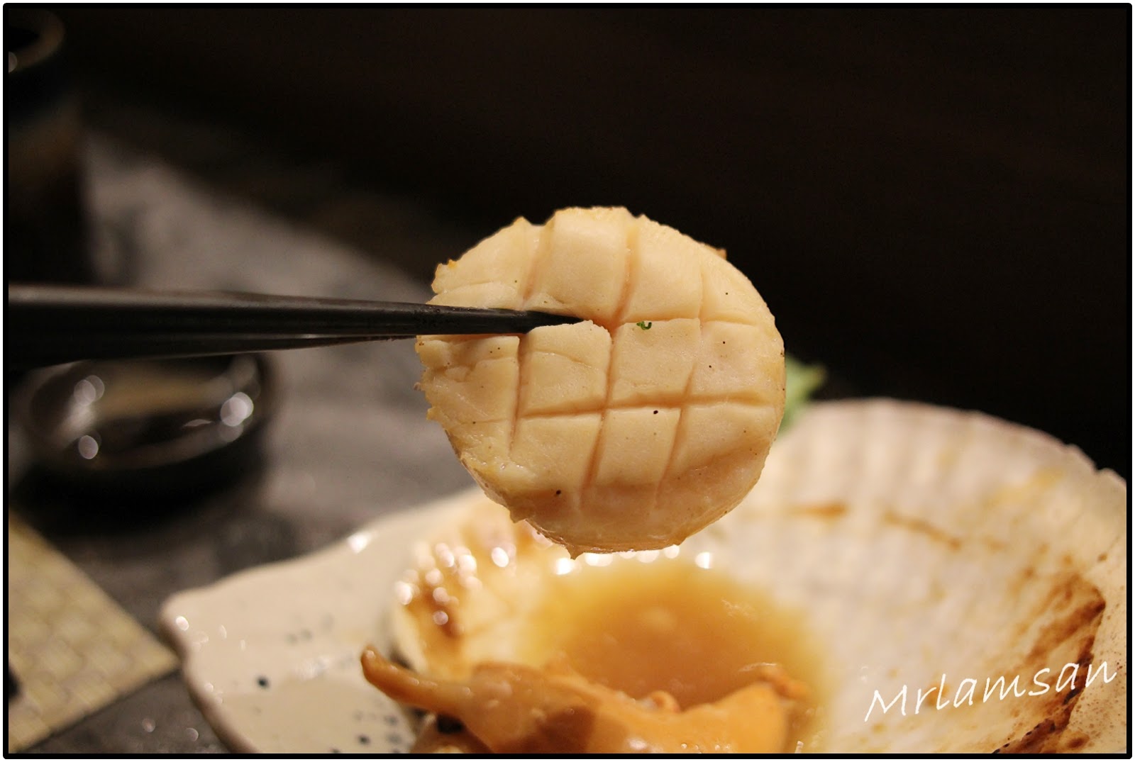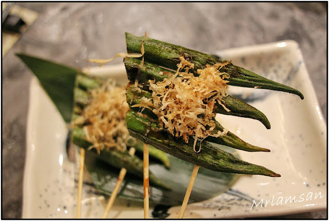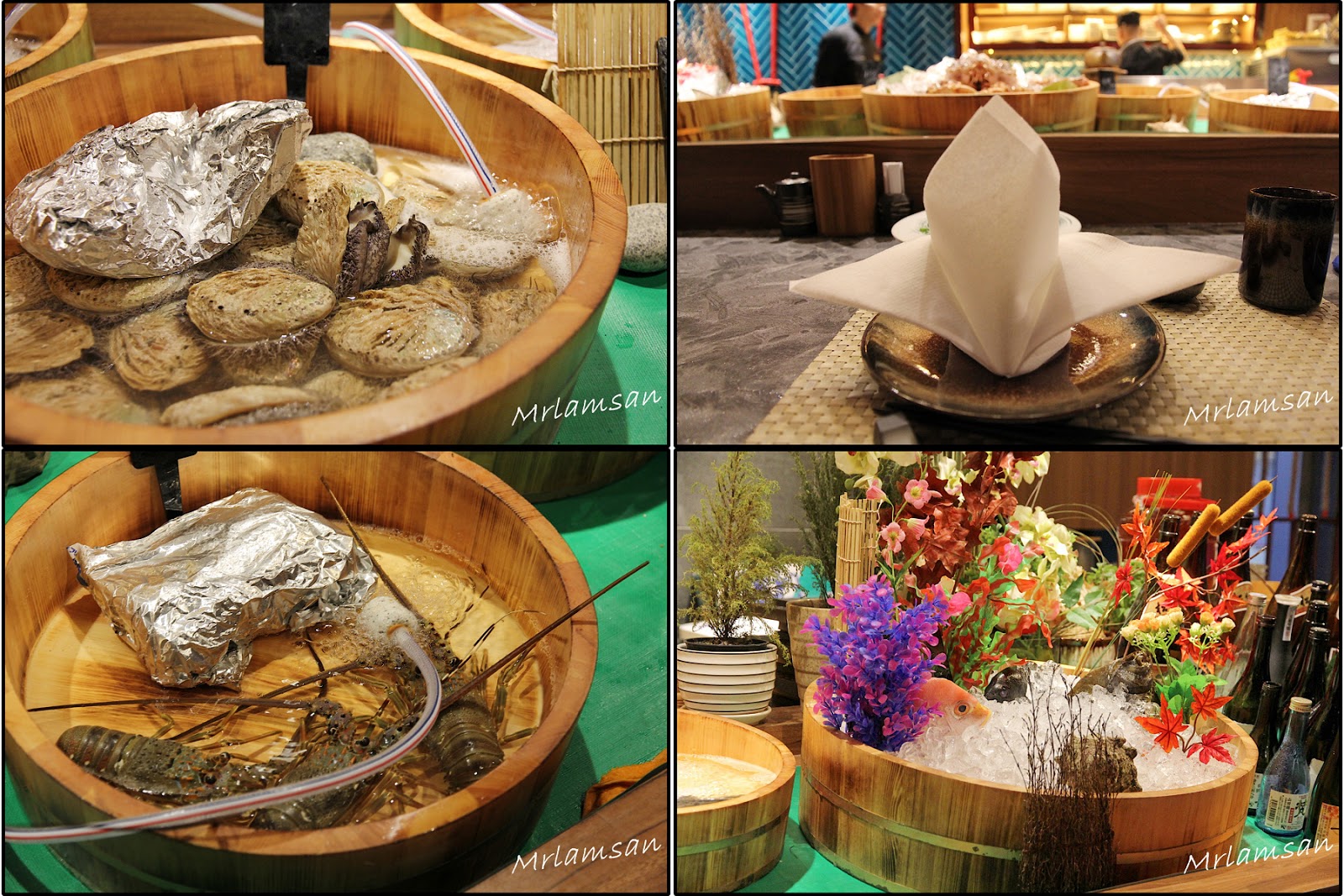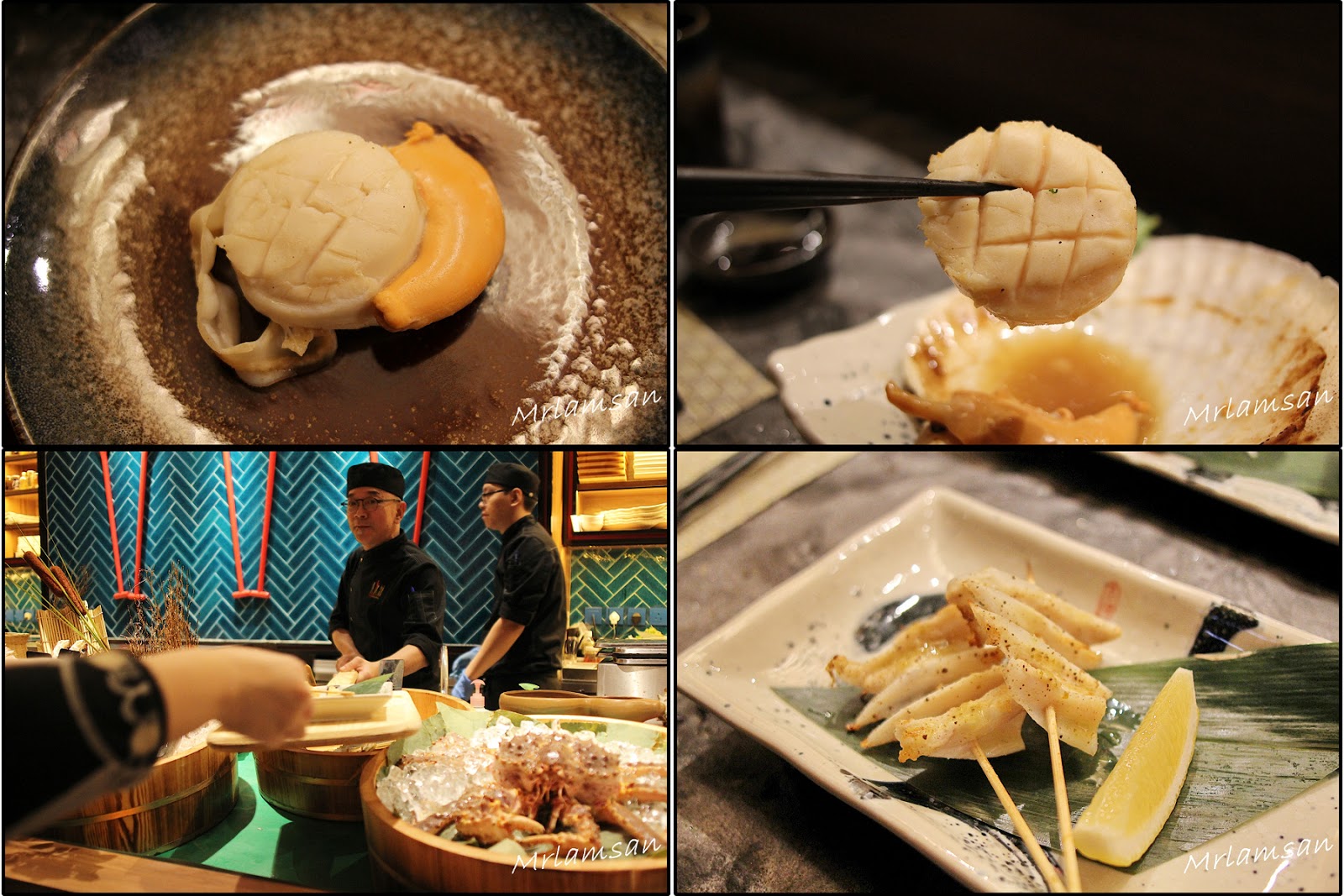 吧枱放滿來自世界各地新鮮海鮮,有美國石蠔、蘇格蘭大蟶子、北海道元貝、南非鮑魚和各式蔬菜,可以燒龍蝦、自家製一夜干馬友、菠蘿、雞翼等