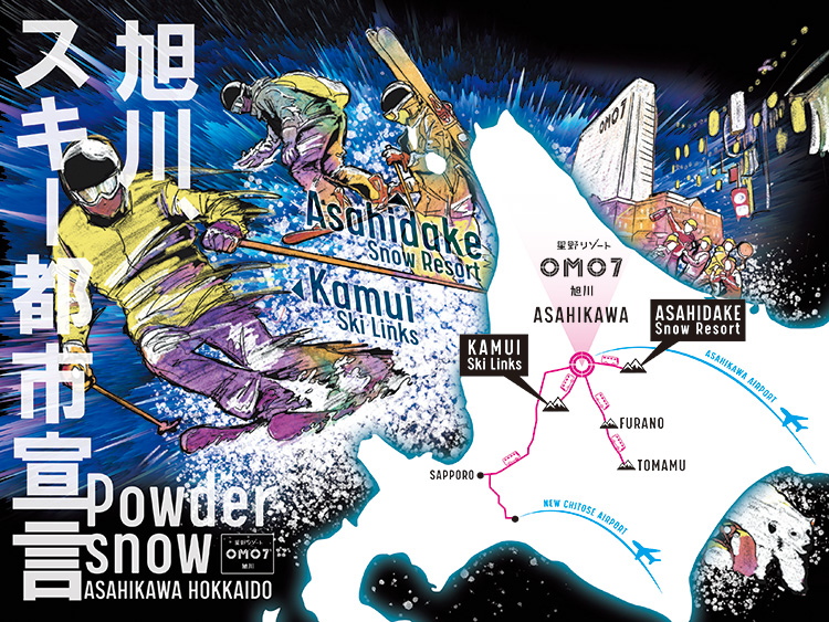 可供選擇的滑雪場有神居滑雪場(kamui-skilinks)、富良野、旭岳,以及星野集團 Tomamu。近年來有「日本粉雪帶」之稱的地帶上的四座高山。OMO7 旭川直接到達四座山的巴士及接駁服務皆已備妥。