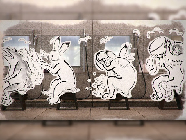 本影片是以有日本最古老漫畫之稱「鳥獸戲畫」來呈現,描繪鳥獸從繪卷裡飛出來體驗溫泉的故事,一邊介紹泡湯禮儀。沒有清洗過身子就進入溫泉、帶著毛巾泡溫泉、大聲向人搭話,說著「真是舒服呢」,由鳥獸戲畫裡的兔子和青蛙相互指出如上述般、因不了解禮儀而造成的誤會,以幽默的手法表現來進行說明。