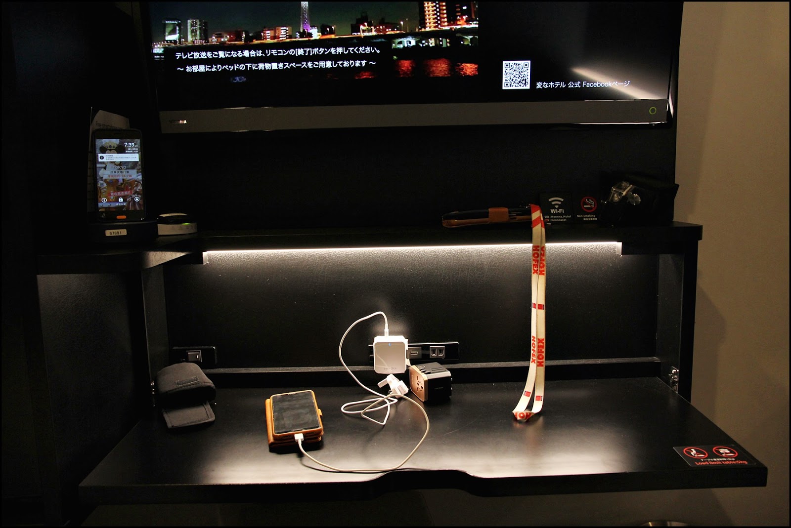櫃下有燈,附有充電位,打開可以放置物件