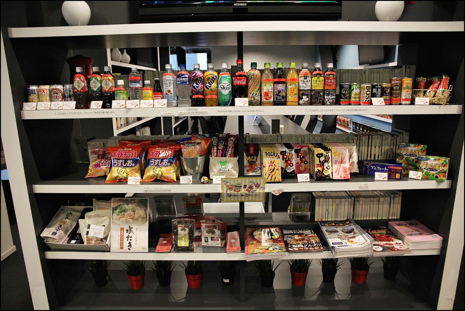 櫃檯前有旅遊資料,零食賣
